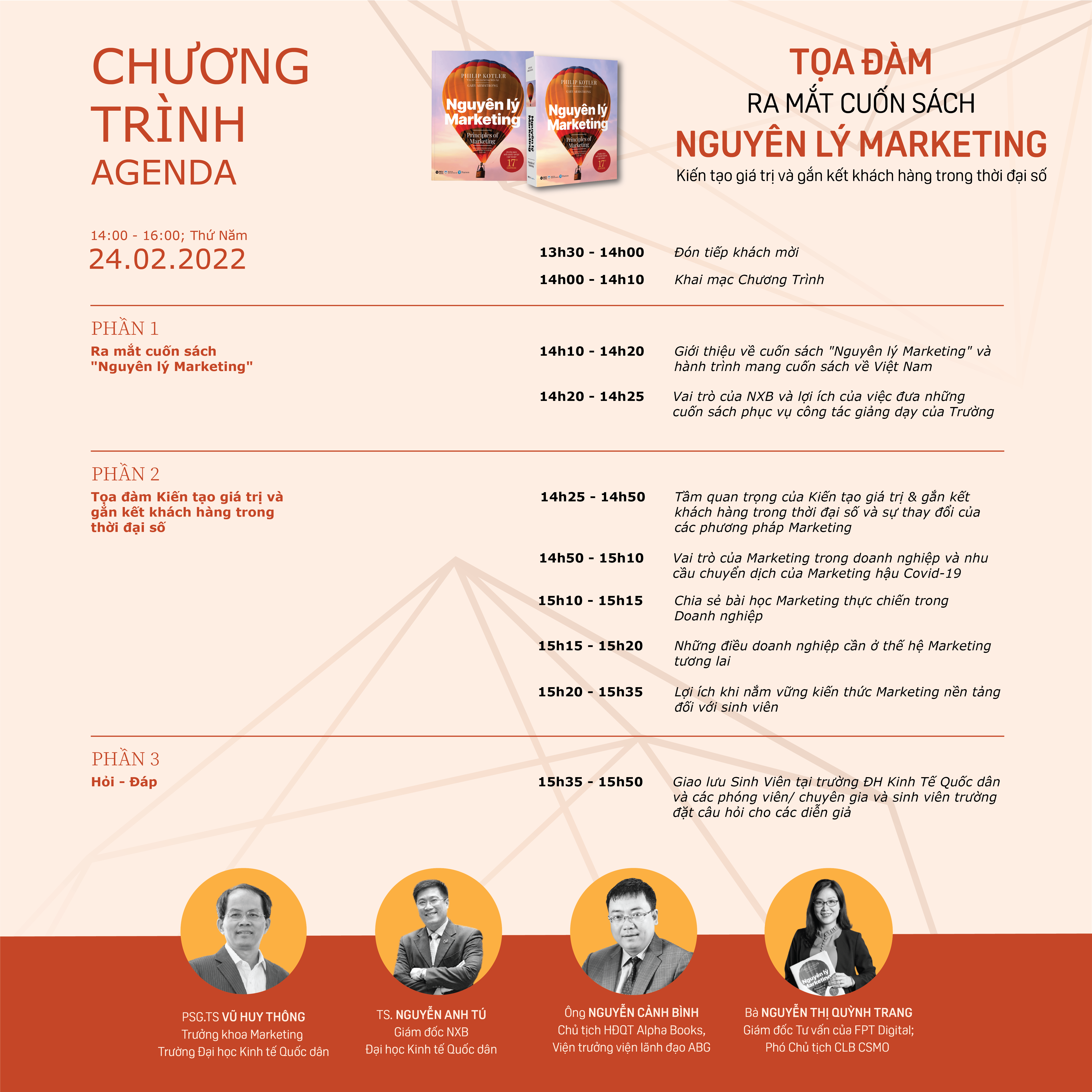 Trong khuôn khổ hoạt động hướng tới kỷ niệm Ngày Sách và Văn hóa đọc Việt Nam 21/04, Ngày Sách và Bản quyền thế giới 23/04, Nhà xuất bản Đại học Kinh tế Quốc dân phối hợp với Công ty cổ phần Sách Alpha (Alpha Books) tổ chức buổi Tọa đàm ra mắt cuốn sách “Nguyên lý Marketing” – Kiến tạo giá trị và gắn kết khách hàng trong thời đại số diễn ra vào 14h00, Thứ Năm, ngày 24/02/2022 tại Hội trường G-01 Tòa A1 Trường Đại học Kinh tế Quốc dân.