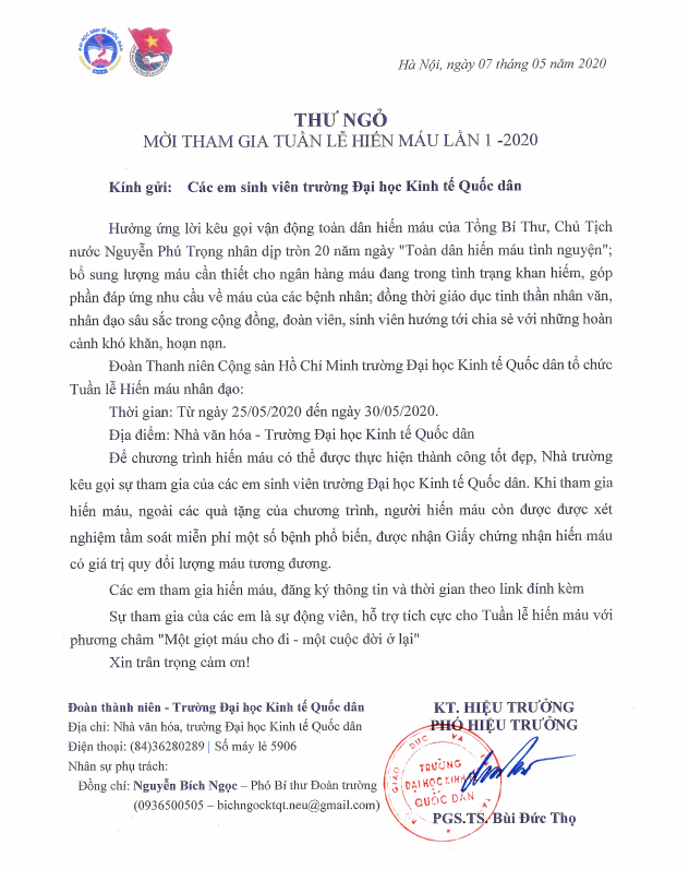 Thư ngỏ mời tham gia tuần lễ Hiến máu lần 1 năm 2020 (dành cho sinh viên Trường ĐHKTQD) Thông báoThư ngỏ mời tham gia tuần lễ Hiến máu lần 1 năm 2020 (dành cho sinh viên Trường ĐHKTQD) LINK ĐĂNG KÝ THAM GIA HIẾN MÁU: https://forms.gle/GMxDiGmnChULsc4k6 Thông tin cung cấp con em cán bộ, viên chức và người lao động nhận qua nhân dịp ngày Quốc tế thiếu nhi năm 2020 Cảm xúc của Tân Giáo sư Trường ĐH KTQD tại Lễ trao Quyết định bổ nhiệm chức danh Giáo sư, Phó Giáo sư và kỷ niệm Ngày Khoa học & Công nghệ Việt Nam
