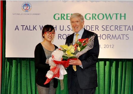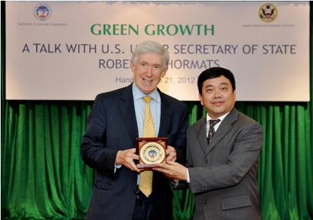 Trong khuôn khổ chuyến thăm và làm việc tại Việt Nam, chiều 21/3, Thứ trưởng Ngoại giao Hoa Kỳ Robert D. Hormats đã tới nói chuyện về chủ đề “Tăng trưởng xanh” với cán bộ, giảng viên và sinh viên Đại học Kinh tế Quốc dân.
