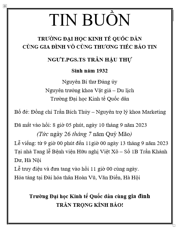 TIN BUỒN: NGƯT.PGS.TS TRẦN HẬU THỰ TỪ TRẦNTIN BUỒN: NGƯT.PGS.TS TRẦN HẬU THỰ TỪ TRẦN Trường Đại học Kinh tế Quốc dân khai mạc “Tuần sinh hoạt công dân năm học 2023 – 2024” NGƯT, PGS.TS Trần Hậu Thự – Người Bí thư Đảng ủy Trường tận tụy, vị Chủ nhiệm Khoa tận tâm, người Thầy tận tình của nhiều thế hệ cán bộ, giảng viên, sinh viên Trường Đại học Kinh tế Quốc dân