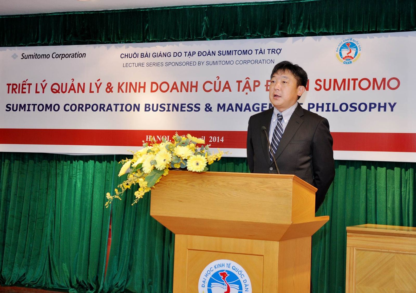 Theo thỏa thuận hợp tác giữa Trường Đại học Kinh tế Quốc dân và Tập đoàn Sumitomo – Nhật Bản ký ngày 29 tháng 11 năm 2013, hàng năm Tập đoàn Sumitomo sẽ tổ chức 2 bài giảng/ năm về lĩnh vực quản trị kinh doanh cho sinh viên của Đại học Kinh tế Quốc dân; và để tiếp tục thực hiện thỏa thuận hợp tác này, sáng ngày 29 tháng 4 năm 2014, tại G2.N10, trường Đại học Kinh tế Quốc dân đã diễn ra Bài giảng số 2 năm 2013 của Tập đoàn Sumitomo – Nhật Bản với chủ đề "Triết lý kinh doanh của Tập đoàn Sumitomo".Tham dự chương trình, về phía Sumitomo có: Ông OKUYAMA Hiroshi – Giám đốc Ban Hành chính và Quan hệ đối ngoại tập đoàn Sumitomo. Về phía trường Đại học Kinh tế Quốc dân có: GS.TS.Trần Thọ Đạt – Phó Hiệu trưởng, PGS.TS.Phạm Trương Hoàng – Trưởng phòng HTQT, TS.Vũ Huy Thông – Phó trưởng khoa Marketing, các phóng viên báo chí, các em sinh viên nhà trường.