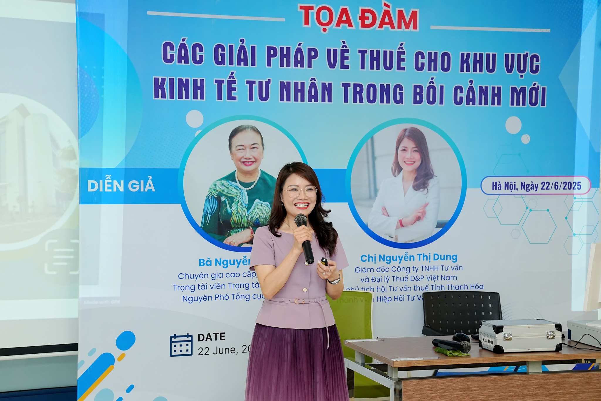 Bà Nguyễn Thị Dung – Giám đốc Công ty TNHH Tư vấn và Đại lý thuế D&P Việt Nam chia sẻ và trình bày tham luận tại Tọa đàm