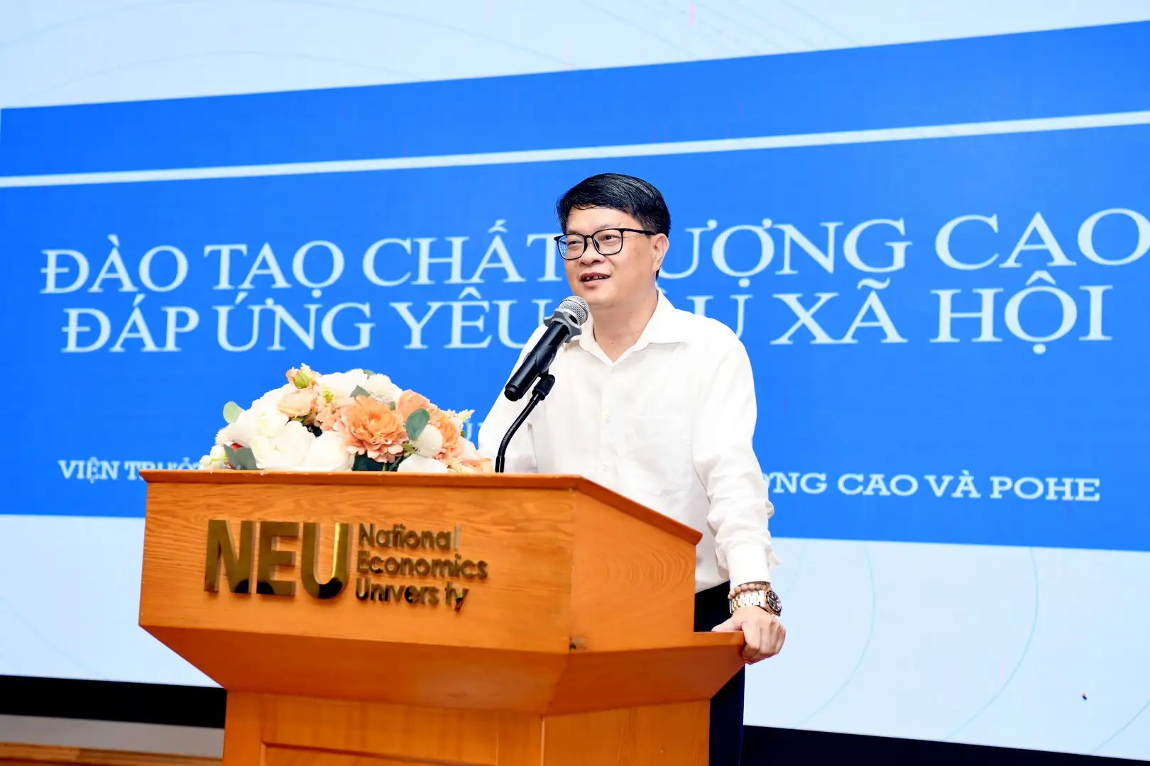 TS. Vũ Văn Ngọc – Viện trưởng Viện Đào tạo TT, CLC & POHE trình bày tham luận “Đào tạo nguồn nhân lực chất lượng cao”