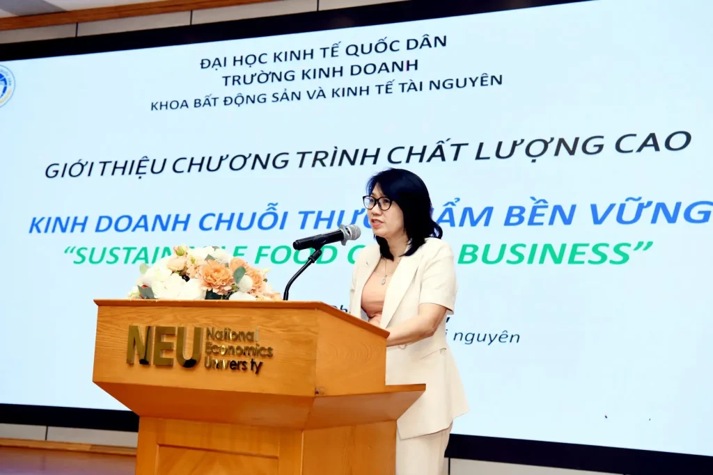 PGS.TS Ngô Thị Phương Thảo – Trưởng khoa Bất động sản & Kinh tế tài nguyên giới thiệu chương trình Chất lượng cao Kinh doanh chuỗi thực phẩm bền vững