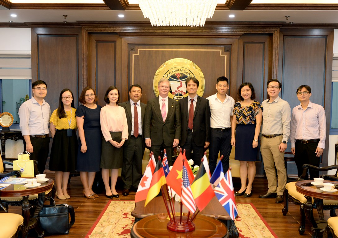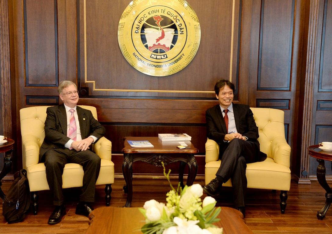 Trước đó, PGS.TS Phạm Hồng Chương – Hiệu trưởng nhà trường đã có buổi tiếp đón và trò chuyện thân mật với ôngJames Michael Kendell – Phó chủ tịch cấp cao của Trung tâm nghiên cứu Năng lượng Châu Á Thái Bình Dương (APERC). PGS.TS Phạm Hồng Chương chia sẻ, Kinh tế Năng lượng trong ứng phó với biến đổi khí hậu là một trong những vấn đề được quan tâm trên toàn cầu và Việt Nam, vì vậy Đại học Kinh tế Quốc dân mong muốn sẽ có thêm nhiều cơ hội hợp tác với các tổ chức học thuật, nghiên cứu trong lĩnh vực năng lượng và biến đổi khí hậu trong tương lai gần. PGS. Hiệu trưởng cảm ơn và hi vọng ông James Michael Kendell cùng các đại biểu, các vị khách quý sẽ có một buổi toạ đàm thành công tại Trường Đại học Kinh tế Quốc dân.
