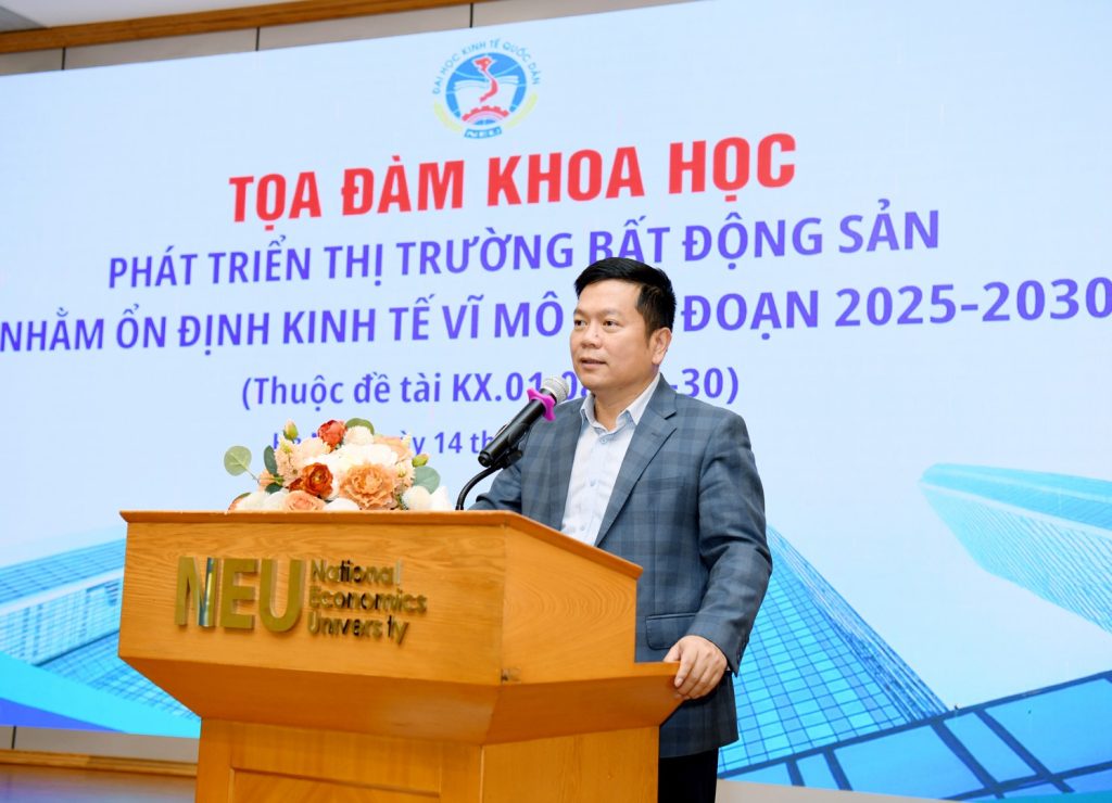 Phó Giám đốc Đại học Kinh tế Quốc dân nêu rõ năm nhóm vấn đề cần tập trung phân tích và đánh giá. Trước hết là mối quan hệ hai chiều giữa thị trường bất động sản và kinh tế vĩ mô – khi thị trường đóng băng có thể kéo giảm tăng trưởng GDP và gây rủi ro cho hệ thống tài chính, trong khi tình trạng tăng nóng lại tiềm ẩn nguy cơ bong bóng và lạm phát kỳ vọng. Bên cạnh đó, bài toán dòng tiền và cấu trúc vốn cũng được nhấn mạnh khi thị trường bất động sản vẫn phụ thuộc nhiều vào tín dụng ngân hàng và trái phiếu doanh nghiệp, trong khi thiếu vắng các kênh dẫn vốn trung và dài hạn bền vững.