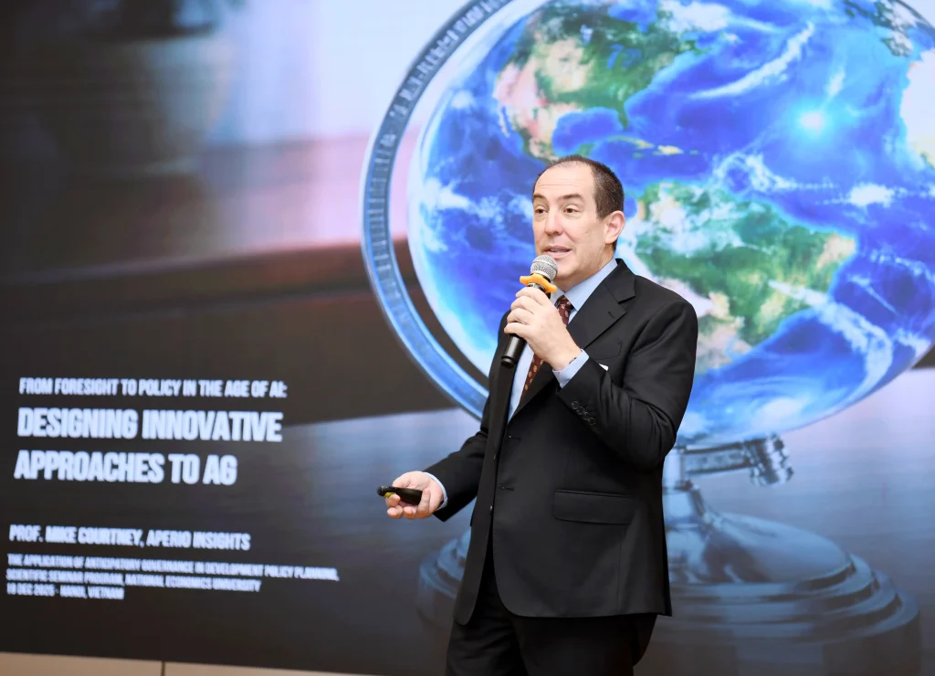 Tọa đàm gồm bốn chuyên đề trình bày chuyên sâu. Mở đầu chương trình, GS. Mike Courtney – Founder/Principal Aperio Insights LLC đã trình bày chuyên đề “From Foresight to Policy in the Age of AI: Designing Innovative Approaches to Anticipatory Governance”, trong đó phân tích những nền tảng lý thuyết cốt lõi và làm rõ cách trí tuệ nhân tạo đang mở ra các cách tiếp cận sáng tạo trong quản trị tiên liệu cũng như quá trình hoạch định chính sách.