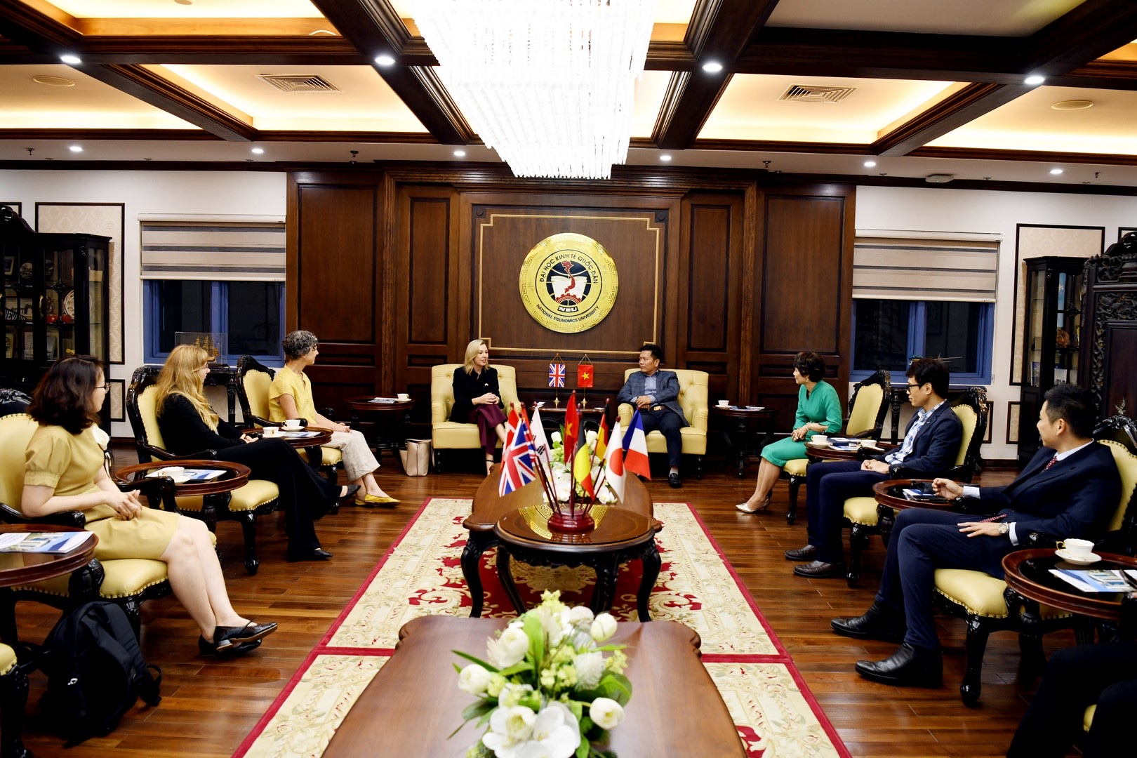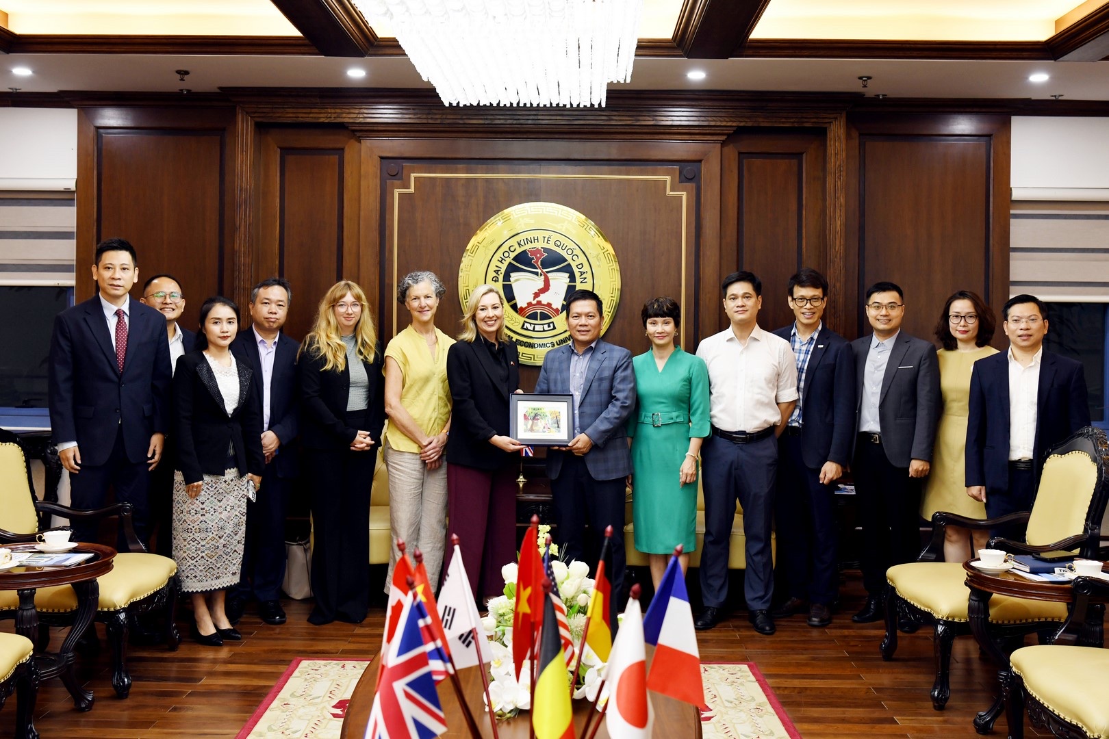 Cũng trong khuôn khổ Tọa đàm, GS.TS Nguyễn Thành Hiếu – Phó Giám đốc Đại học Kinh tế Quốc dân cùng đại diện lãnh đạo các đơn vị đã có buổi tiếp đón thân mật và trao đổi với bà Anna Gibson – Tham tán Khí hậu, Đại sứ quán Anh tại Việt Nam, cùng các đại biểu và diễn giả khách mời. Nội dung cuộc gặp tập trung vào cơ hội hợp tác trong nghiên cứu, cung cấp các bằng chứng khoa học phục vụ hoạch định chính sách phát triển bền vững trong thời gian tới.