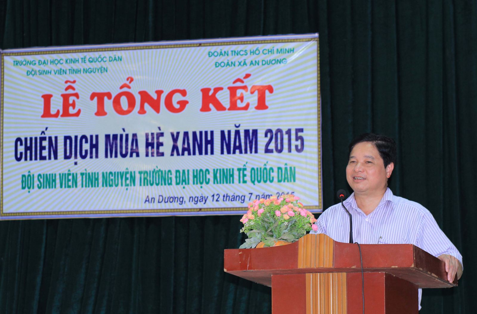 Thay mặt lãnh đạo Nhà trường, GS.TS Phạm Quang Trung phát biểu cảm ơn sự có mặt của các đại biểu tham dự buổi lễ vàmột lần nữa nhấn mạnh tình cảm đặc biệt giữa tập thể sư phạm Nhà trường và địa phương trong những năm qua. GS.TS Phạm Quang Trung khẳng định Chiến dịch Mùa hè Thanh niên tình nguyện năm 2015 là một trong những hoạt động trọng điểm để tuổi trẻ Nhà trường tri ân địa phương nơi trường về sơ tán.