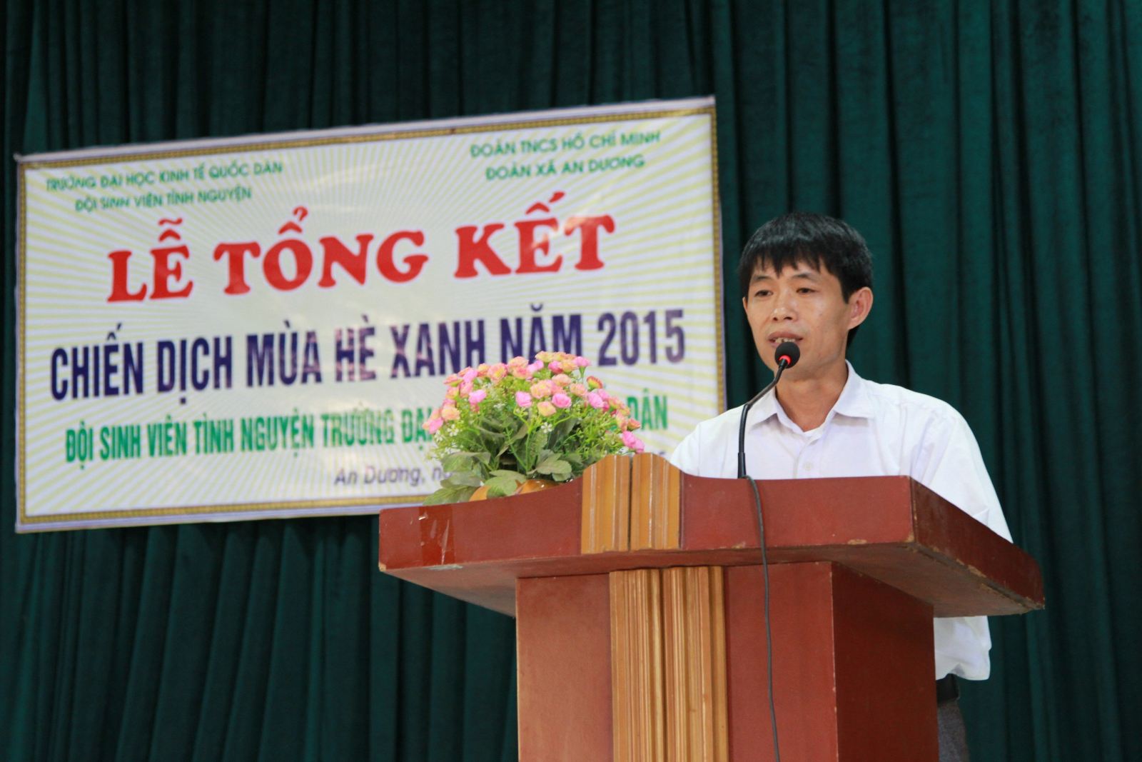 Đồng chí Vũ Công Kha – Phó Bí thư Đảng ủy – Chủ tịch UBND xã An Dương cảm ơn sự quan tâm sát sao của lãnh đạo Nhà trường, sự tâm huyết trong các hoạt động của tuổi trẻ Nhà trường mang lại cho địa phương. Đồng chí Vũ Công Kha phấn khởi gửi tặng đại biểu một bài hát chứa đựng nhiều tình cảm và tấm lòng của địa phương đối với Nhà trường.