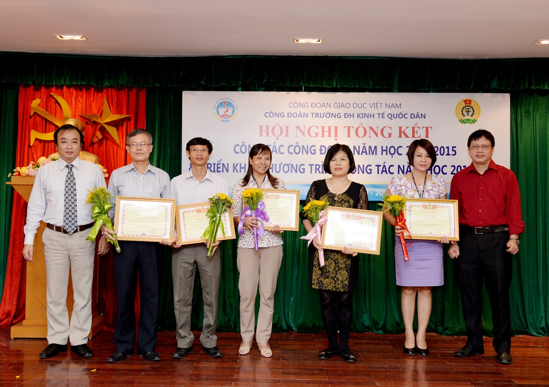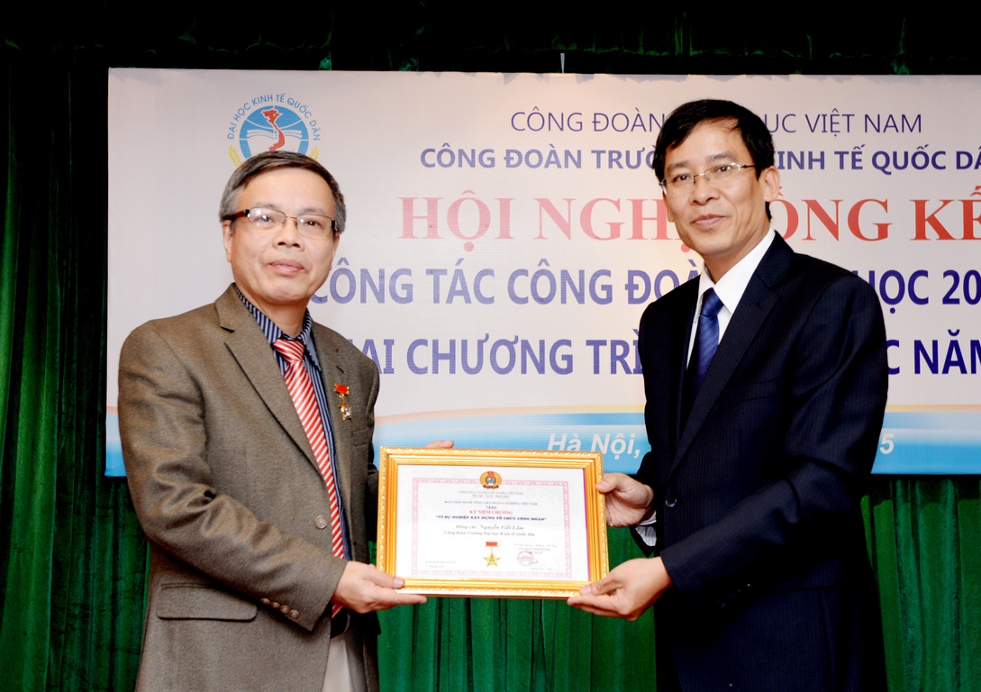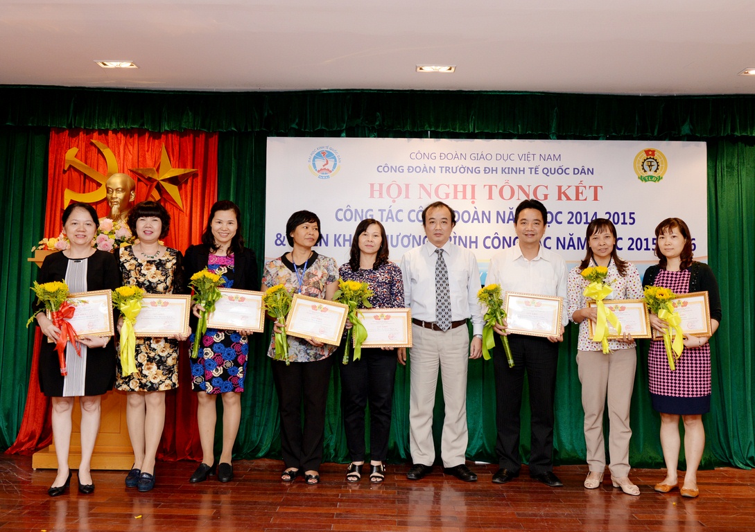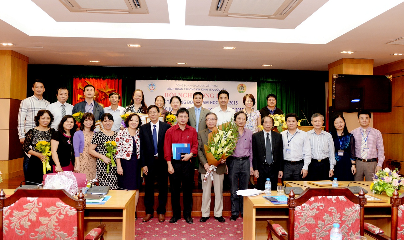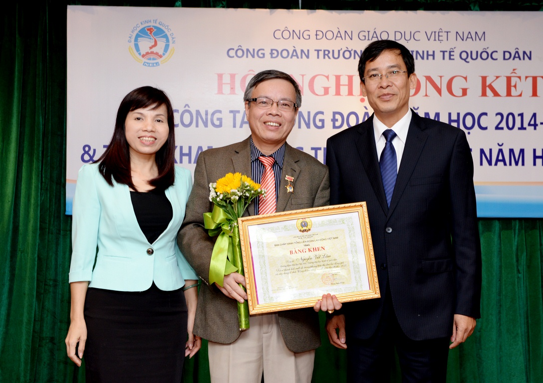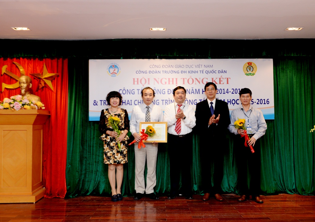 TS Vũ Minh Đức – Chủ tịch CĐ GDVN trao Bằng khen của Tổng liên đoàn Lao động Việt Nam cho Công đoàn cơ sở Trường Đại học Kinh tế Quốc dân, đã có thành tích xuất sắc trong phong trào thi đua lao động giỏi và xây dựng tổ chức Công đoàn Vững mạnh năm học 2014 – 2015; GS.TS Trần Thọ Đạt tặng hoa chúc mừng
