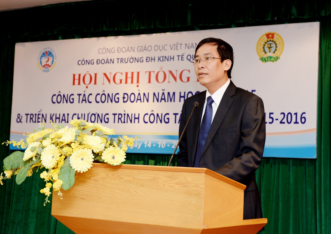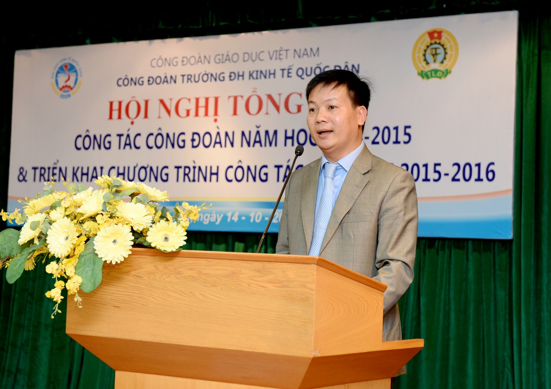 Về năm học 2015- 2016, TS Vũ Minh Đức cho rằng đây là năm học có nhiều ý nghĩa trọng đại đối với cả nước nói chung và trường ĐHKTQD nói riêng. Công đoàn Giáo dục Việt nam bày tỏ sự đồng tình với những nội dung, chương trình công tác của do BCH Công đoàn Trường  nêu trong báo cáo; đồng thời trao đổi thêm một số vấn đề có tính định hướng như: Các cấp công đoàn trong Nhà trường cần nhận thức sâu sắc hơn nữa tình hình và yêu cầu nhiệm vụ trong tình hình mới, từ đó tiếp tục đổi mới nội dung và phương thức hoạt động Công đoàn trong điều kiện Nhà trường chuyển sang cơ chế tự chủ, tự chịu trách nhiệm; Các cấp công đoàn trong Nhà trường cần tiếp tục sâu sát hơn nữa với đời sốngcủa Nhà giáo và người lao động, chủ động và kịp thời nắm bắt tâm tư, nguyện vọng của đoàn viên; Làm tốt việc quan tâm, chăm lo đời sống vật chất và tinh thần đi đôi với việc bảo vệ quyền và lợi ích hợp pháp, chính đáng của người lao động; Tiếp tục triển khai thực hiện Nghị quyết Đại hội 14 và Kế hoạch hành động của Công đoàn Giáo dục Việt Nam thực hiện Nghị quyết 29 BCH Trung ương khóa XI về đổi mới căn bản, toàn diện giáo dục Việt Nam; Cần phải tạo lập được những phong trào, những hoạt động có nét đặc trưng riêng, phù hợp với tiềm năng và thế mạnh cũng như đáp ứng nhua cầu của Nhà giáo và người lao động của Nhà trường; Luôn luôn coi trọng công tác xây dựng tổ chức công đoàn vững mạnh toàn diện, chú trọng công tác quy hoạch, đào tạo, bồi dưỡng nâng cao năng lực và kỹ năng hoạt động của cán bộ công đoàn; Tranh thủ tối đa sự lãnh đạo của Đảng ủy, sự phối hợp, hỗ trợ của Ban Giám hiệu và các đơn vị chức năng trong Nhà trường; tạo môi trường thuận lợi cho hoạt động công đoàn. Đề xuất với Đảng ủy và Ban Giám hiệu Nhà trường quan tâm, bồi dưỡng, xem xét bổ nhiệm những cán bộ Công đoàn vào bộ máy quản lý của Nhà trường; thực sự coi Cán bộ Công đoàn là nguồn bổ sung cán bộ quản lý.