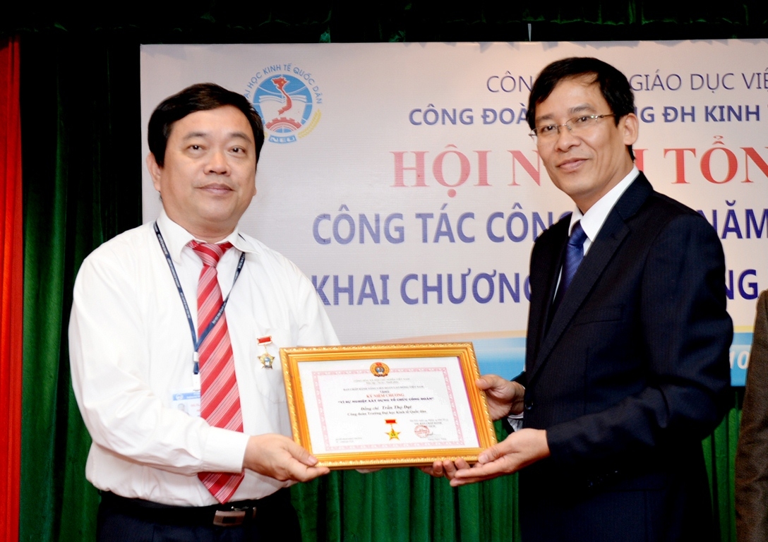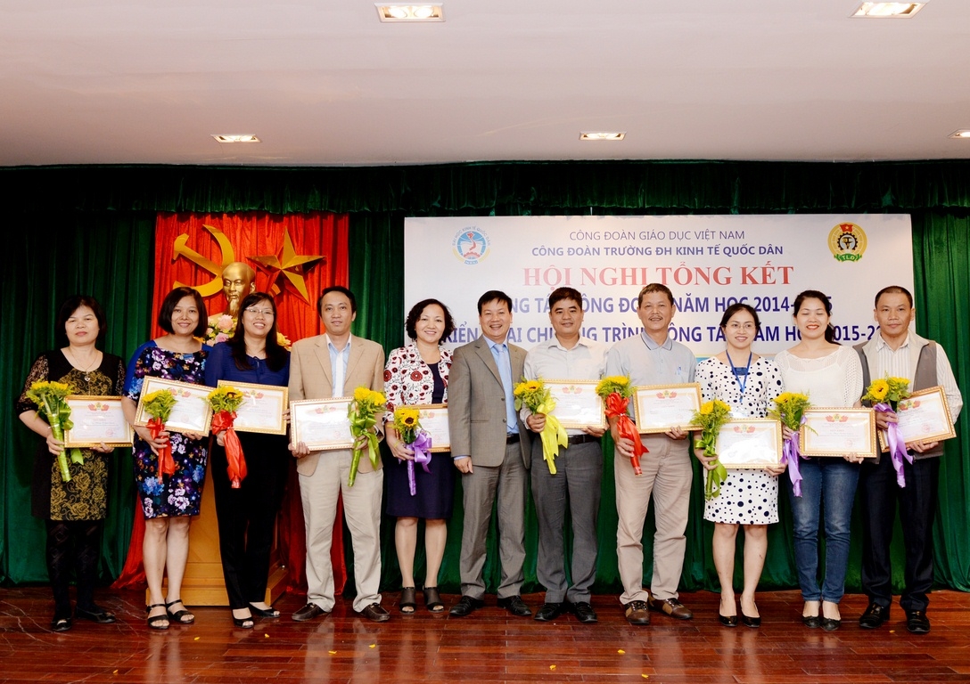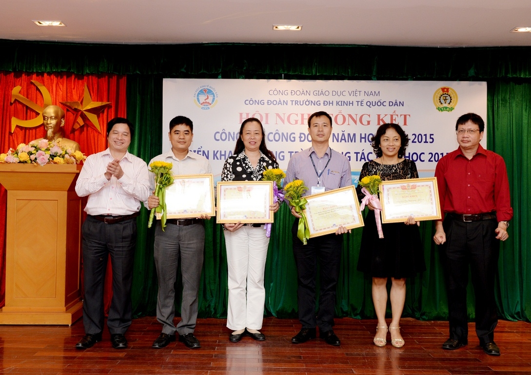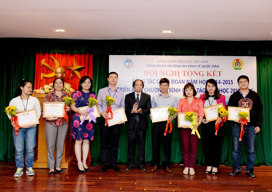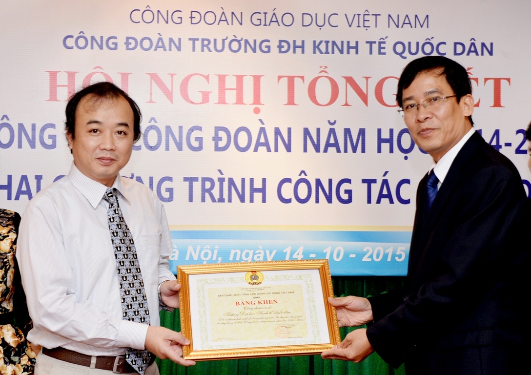 TS Vũ Minh Đức – Chủ tịch CĐ GDVN trao Bằng khen của Tổng liên đoàn Lao động Việt Nam cho Công đoàn cơ sở Trường Đại học Kinh tế Quốc dân, đã có thành tích xuất sắc trong phong trào thi đua lao động giỏi và xây dựng tổ chức Công đoàn Vững mạnh năm học 2014 – 2015; GS.TS Trần Thọ Đạt tặng hoa chúc mừng