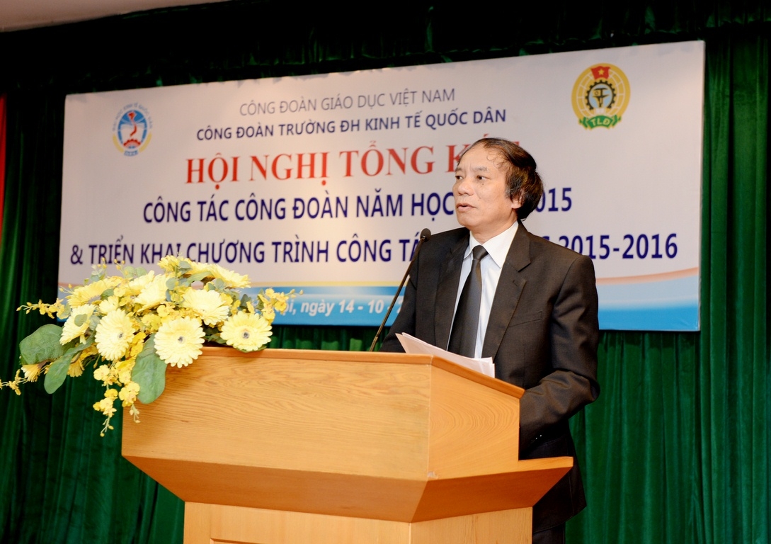 Thay mặt cho lãnh đạo trường, GS.TS Trần Thọ Đạt – Bí thư Đảng ủy, Hiệu trưởng đã phát biểu trân trọng cảm ơn sự có mặt, động viên, đánh giá của đồng chí Chủ tịch Công đoàn ngành, của Công đoàn ngành Giáo dục Việt Nam đối với hoạt động Công đoàn trường Đại học Kinh tế quốc dân. Đồng thời Nhà trường ghi nhận và đánh giá cao nỗ lực của Công đoàn Trường, Công đoàn bộ phận trong năm học vừa qua đã nỗ lực phấn đấu để có những thành tích rất đáng khích lệ và đặc biệt các đồng chí đã đề xuất những phương hướng, chương trình hành động, giải pháp hoạt động trong năm học tới. Giáo sư Hiệu trưởng đã đề nghị Công đoàn trường cần kịp thời tiếp nhận những chỉ đạo sâu sát thường xuyên hơn của Công đoàn ngành và có sự kết nối chặt chẽ hơn, bên cạnh đó hoạt động Công đoàn cần phải gắn kết với công đoàn bộ phận, qua đó tạo sức mạnh đoàn kết tập thể, để thực hiện tốt nhiệmvụ là tổ chức chính trị – xã hội bảo vệ quyền lợi chính đáng, tuyên truyền đường lối chủ trường của Đảng, chính sách pháp luật của Nhà nước để xây dựng tập thể trường ĐHKTQD thành một tập thể ngày càng vững mạnh, đi lên trong bối cảnh nhà trường của chúng ta thực hiện tự chủ. Giáo sư Hiệu trưởng mong muốn Công đoàn trường cần nắm kịp thời hơn, toàn diện đầy đủ, dân chủ hơn về tâm tư nguyện vọng của đoàn viên Công đoàn trường để không xảy ra những vấn đề chưa được giải quyết một cách kịp thời, dẫn tới tình trạng đơn thư vượt cấp, ảnh hưởng đến uy tín của Nhà trường. Cuối cùng, thay mặt cho Đảng ủy – BGH nhà trường, Giáo sư Hiệu trưởng đánh giá cao, xin chúc mừng hoạt động của Công đoàn trường trong thời gian vừa qua, cảm ơn sự chỉ đạo sát sao kịp thời, đặc biệt là sự có mặt của đồng chí Chủ tịch Công đoàn ngành Giáo dục Việt Nam – TS Vũ Minh Đức là nguồn cổ vũ, động viên rất lớn cho Công đoàn trường ĐHKTQD. Chúc hoạt động Công đoàn của trường ĐHKTQD có nhiều khởi sắc, tập thể trường ĐHKTQD là một tập thể vững vàng trên con đường phát triển 2015 – 2016.
