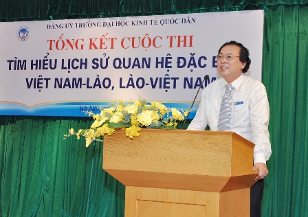 Sau bài báo cáo tổng kết cuộc thi của Ban tuyên giáo Đảng uỷ GS.TS Nguyễn Văn Nam- Bí thư Đảng uỷ, Hiệu trưởng phát biểu ghi nhận kết quả và thành công của cuộc thi, GS nhấn mạnh: Kết quả cuộc thi không chỉ dừng lại ở tính phong trào hay các giải thưởng mà quan trọng là ý nghĩa nhân văn và giá trị tuyên truyền giáo dục rất ý nghĩa của cuộc thi. Đó là sự ghi nhận, tôn vinh và là niềm tự hào của thế hệ ngày nay về mối quan hệ hữu nghị đặc biệt giữa hai nước Việt Nam-Lào, Lào-Việt Nam. GS mong muốn thế hệ ngày nay phải có trách nhiệm không ngừng củng cố và phát triển, nâng cao mối quan hệ đặc biệt giữa hai nước lên một tầm cao mới bằng những việc làm cụ thể, thiết thực hàng ngày. Đặc biệt là Trường Đại học Kinh tế Quốc dân được Đảng và Nhà nước giao nhiệm vụ tham gia Đào tạo nguồn nhân lực cho Lào ở các bậc: Đại học, Cao học và Nghiên cứu sinh nhiều năn nay. Năm 2011 Trường đã phối hợp với Văn phòng Chính phủ Lào tổ chức thành công Hội thảo khoa học “Phát triển kinh tế-xã hội Việt Nam-Lào” và tháng 10-2012 sắp tới Trường tiếp tục phối hợp với Văn phòng Chính phủ Lào tổ chức Hội thảo khoa học “Hợp tác kinh tế Việt Nam-Lào về phát triển một số ngành kinh tế mũi nhọn tới năm 2020”. Đó chính là những việc làm thiết thực, cụ thể để góp phần củng cố và phát triển mối quan hệ đặc biệt Việt Nam-Lào, Lào-Việt Nam.