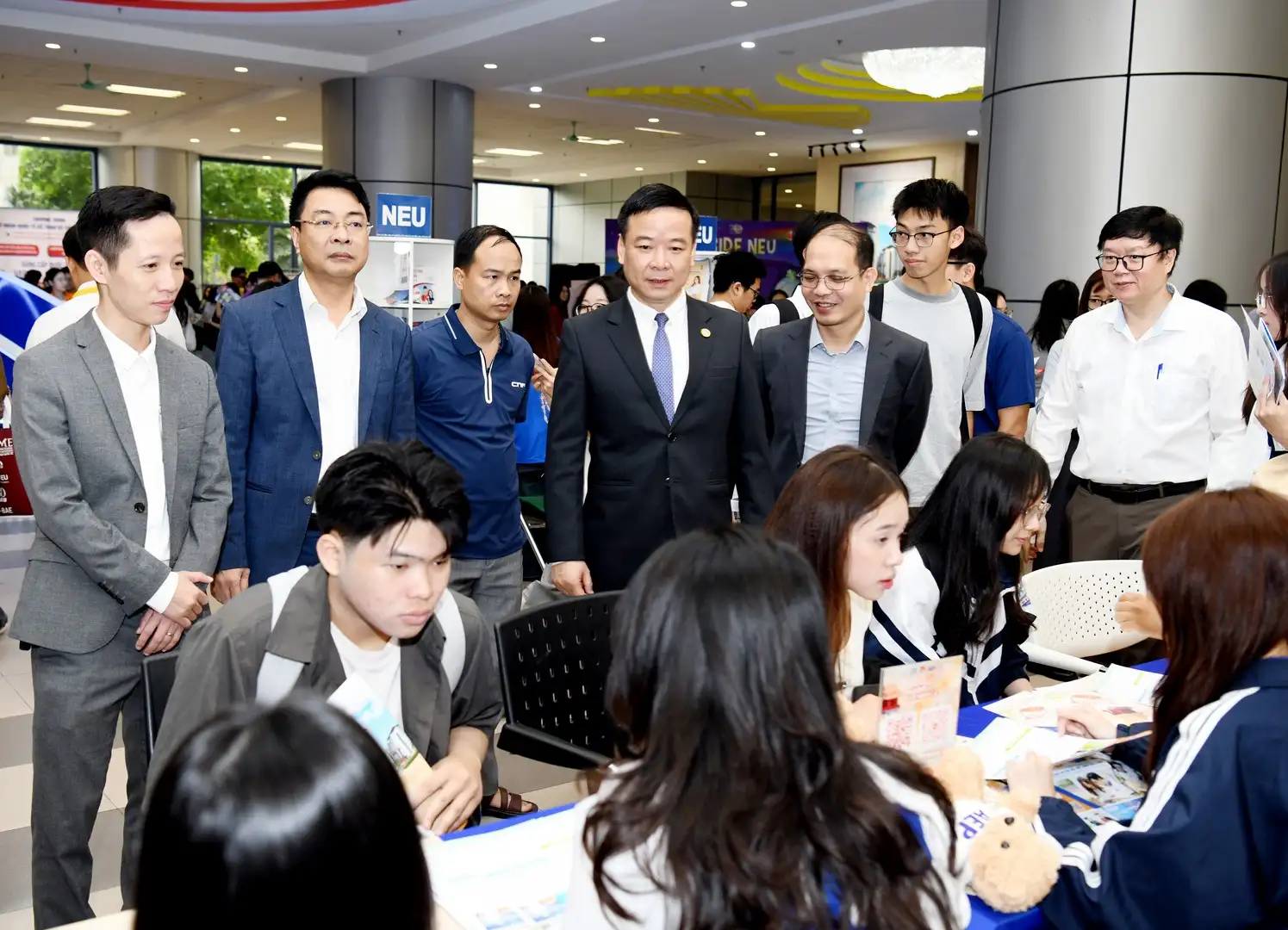 Lãnh đạo Đại học thăm các gian tư vấn tại chương trình “Một ngày là sinh viên Kinh tế Quốc dân”