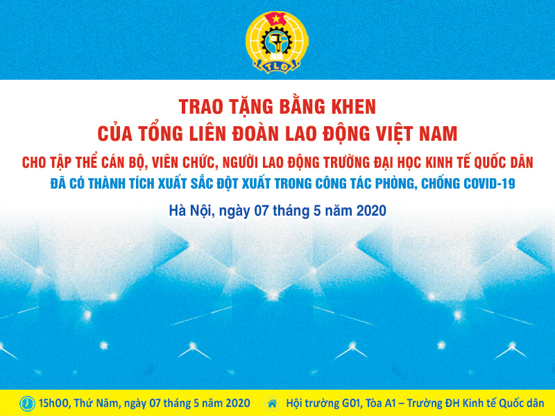07/05/2020 2020-05-07 19:26Trao tặng bằng khen của Tổng Liên đoàn Lao động Việt Nam cho tập thể cán bộ, viên chức, người lao động Trường Đại học Kinh tế Quốc dân đã có thành tích xuất sắc đột xuất trong công tác phòng, chống Covid-19