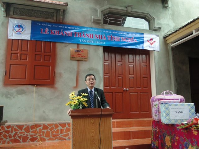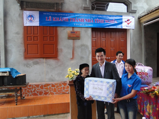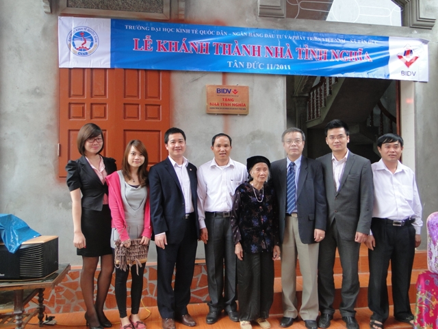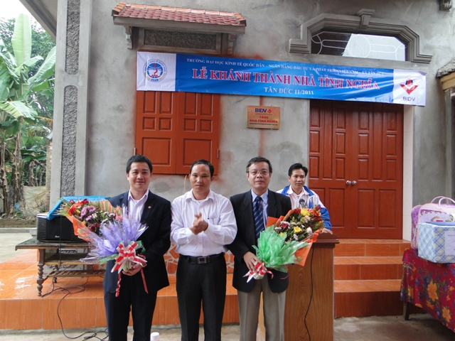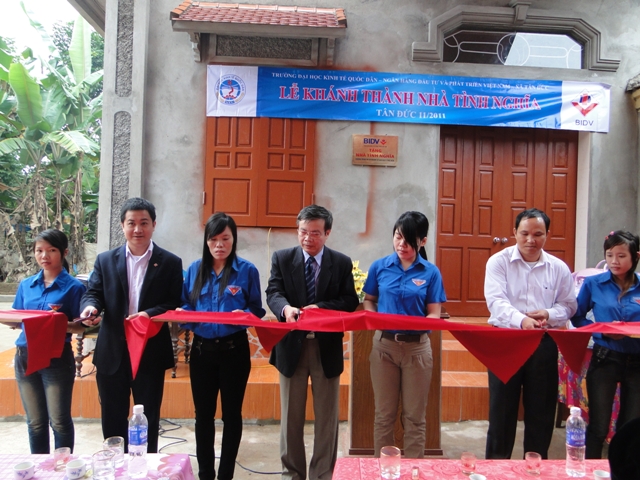 Sau gần hai tháng phát động thực hiện xây dựng với tổng kinh phí là 130 triệu đồng, sáng ngày 30/10/2011, Trường Đại học Kinh tế Quốc dân, Sở giao dịch 1 Ngân hàng Đầu tư và phát triển Việt Nam, xã Đoàn Tân Đứcvà các cấp chính quyền địa phương đã tổ chức buổi lễ cắt băng khánh thành, bàn giao và đưa vào sử dụng công trình nhà tình nghĩa, có thể nói đây là công trình ý nghĩa thiết thực chào mừng 55 năm thành lập trường, 20 năm thành lập sở giao dịch 1 Ngân hàng BIDV. Đến tham dự buổi lễ có PGS.TS. Nguyễn Viết Lâm – Phó Bí thư Đảng uỷ trường Đại học Kinh tế Quốc dân; ThS. Nguyễn Hoàng Hà – Bí thư Đoàn trường Đại học Kinh tế Quốc dân; Ông Lưu Quang Hiệp – Phó Giám đốc Sở giao dịch 1 Ngân hàng đầu tư và phát triển Việt Nam; Ông Dương Văn Hiển – Bí thư Đảng bộ, CT HĐND xã, Ông Đào Minh Hải – Huyện uỷ viên, Phó bí thư, Chủ tịch UBND xã.