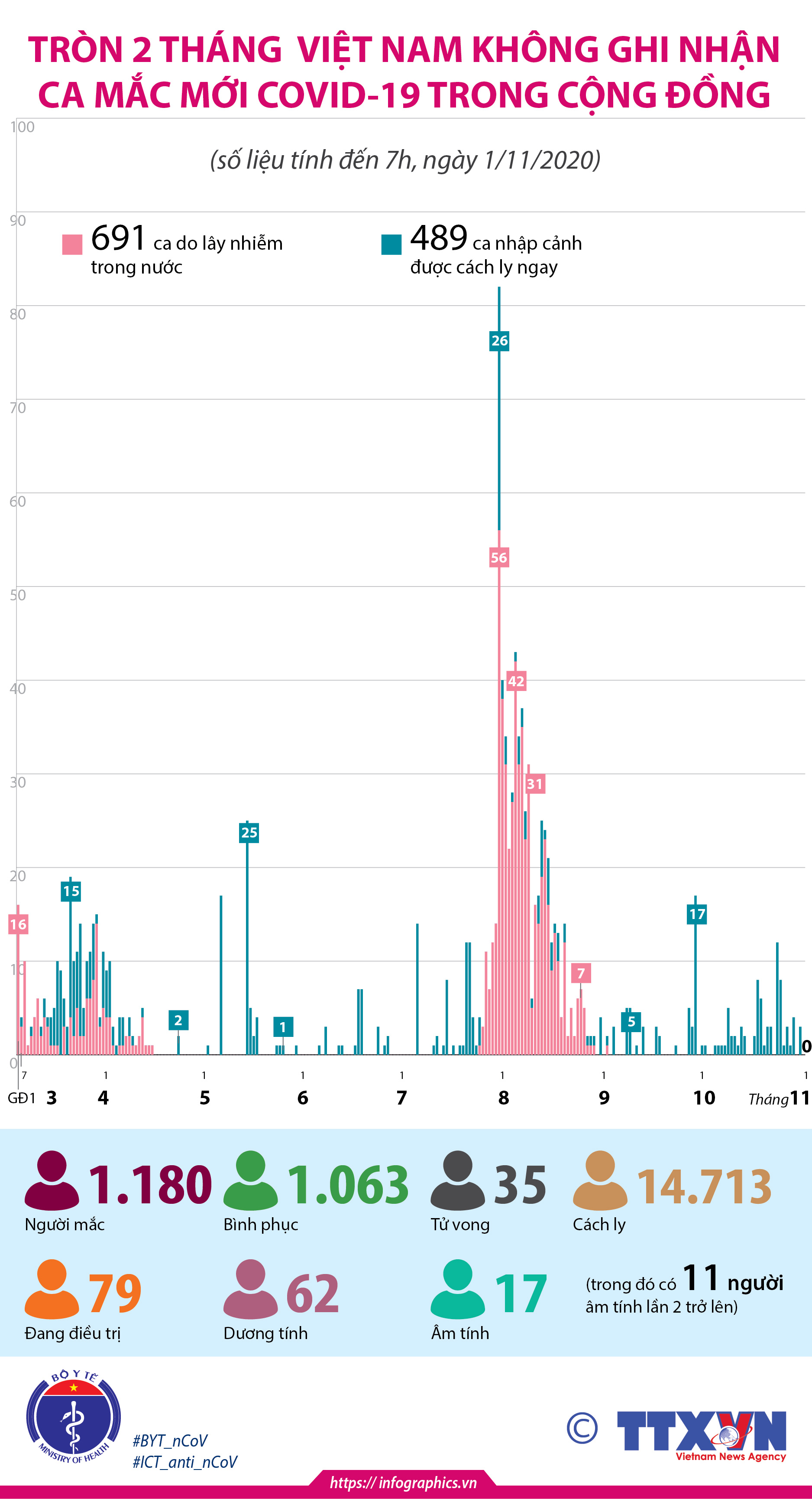 Sáng 1/11/2020, Việt Nam không ghi nhận ca mắc mới COVID-19 trong cộng đồng. Tổng số ca mắc COVID-19 tại Việt Nam hiện là 1.180 ca.