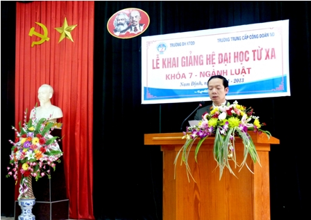 Phát biểu tại buổi lễ, TS. Lê Trung Thành – Giám đốc Trung tâm Đào tạo Từ xa Đại học Kinh tế Quốc dân đã nhiệt liệt biểu dương tinh thần vượt khó, ý thức chấp hành quy chế học tập, nỗ lực học hỏi và đã hoàn thành xuất sắc khoá học của các em sinh viên, đồng thời cảm ơn sự quan tâm, giúp đỡ, tạo mọi điều kiện thuận lợi cho các em sinh viên học tập của Ban lãnh đạo, các phòng ban trường Trung cấp Công Đoàn tỉnh Nam Định, các thầy cô giáo trực tiếp giảng dạy và mong rằng các tân cử nhân bằng nhiệt huyết của tuổi trẻ hãy vận dụng những kiến thức kinh tế và quản trị kinh doanh đã được trang bị vào thực tế để phát triển sự nghiệp của chính mình, góp phần xây dựng quê hương, đất nước – đó cũng chính là điều mà Nhà trường, các thầy cô giáo mong đợi ở các tân cử nhân.