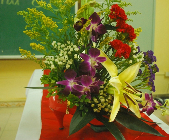 Lẵng hoa độc đáo với phần đế là chiếc giầy cao gót xinh xắn của Lớp Ngữ Âm A
