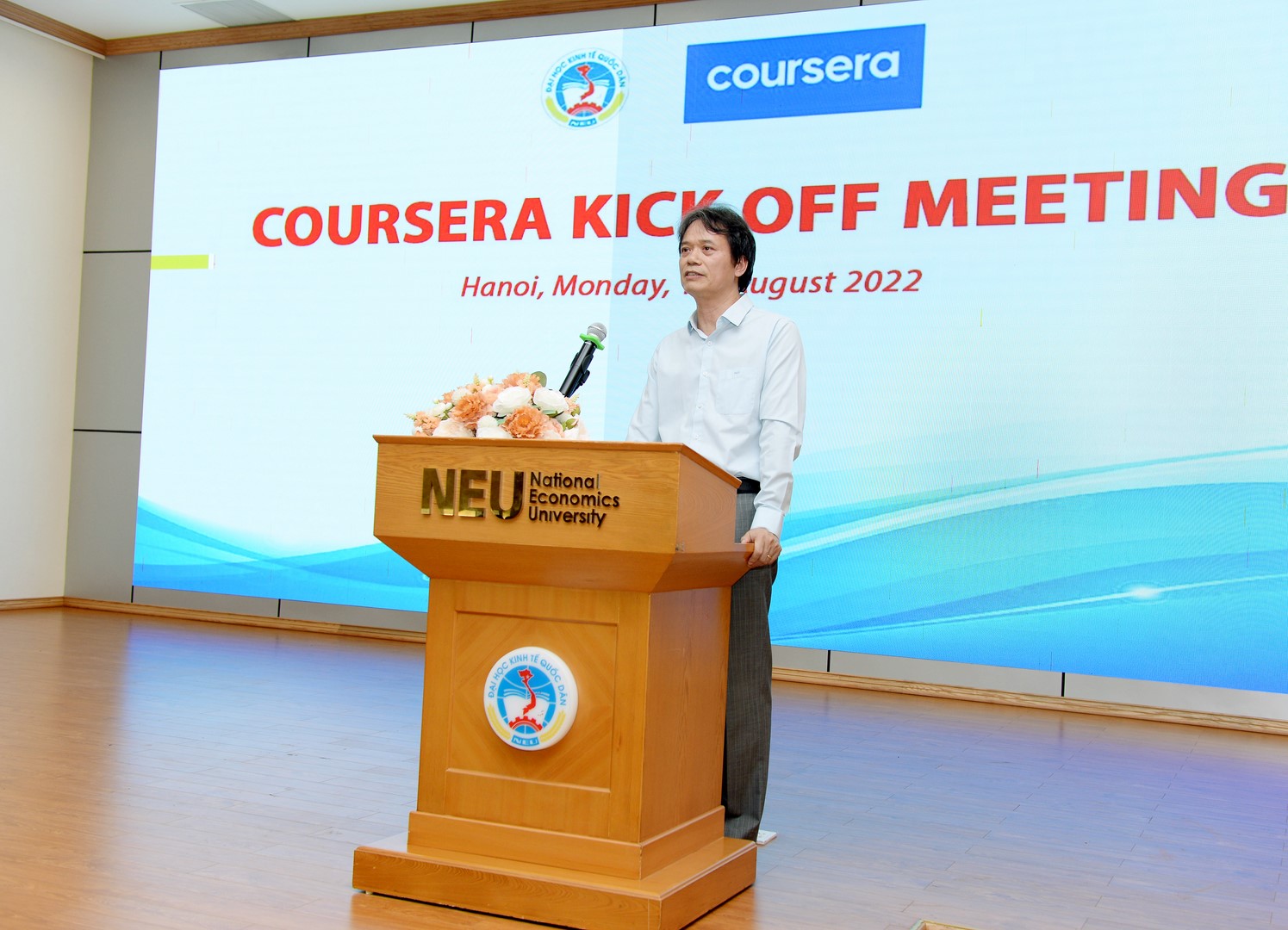 Chiều ngày 1/8/2022, Trường Đại học Kinh tế Quốc dân phối hợp với Công ty công nghệ giáo dục Coursera tổ chức khai giảng khóa học trực tuyến trên nền tảng Coursera cho 85 cán bộ, giảng viên của Nhà trường.
