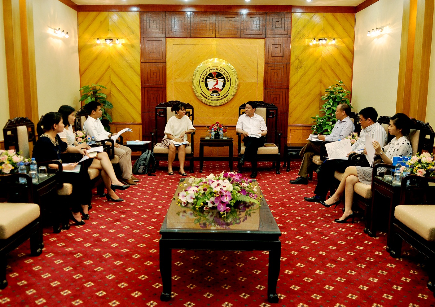 Chiều ngày 21 tháng 5 năm 2014, tại phòng Khánh tiết G2N10, GS.TS.Trần Thọ Đạt, Phó Hiệu trưởng thay mặt cho lãnh đạo nhà trường đã có buổi tiếp và làm việc với bà Monruedee Donsrichan – Giám đốc Marketing NXB Sách Giáo dục McGraw-Hill khu vực Đông Dương. Cùng tham gia buổi làm việc còn có PGS.TS. Phạm Trương Hoàng, Trưởng phòng Hợp tác Quốc tế; ThS. Nguyễn Anh Tú, Giám đốc Nhà xuất bản Đại học Kinh tế Quốc dân và đại diện công ty Nam Hoàng – công ty chuyên hoạt động trong lĩnh vực thông tin tư liệu và tự động hoá thư viện.