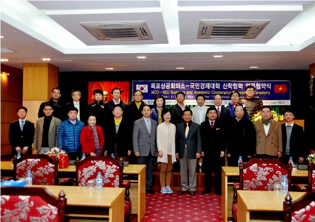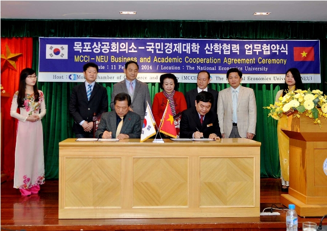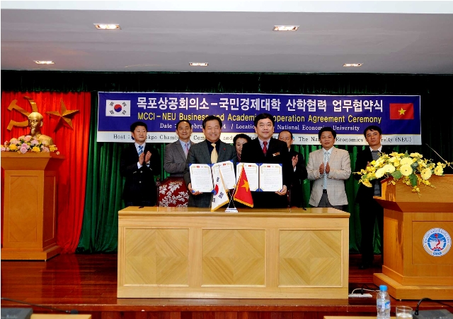 Nhân dịp này, Trường Đại học Kinh tế Quốc dân đã tổ chức ký kết thỏa thuận hợp tác giữa Trường Đại học Kinh tế Quốc dân và Phòng Thương mại và Công nghiệp tỉnh Mokpo Hàn Quốc với mục tiêu chính là hợp tác trong lĩnh vực kinh tế, trao đổi văn hóa và các hình thức hợp tác học thuật khác. GS.TS.Trần Thọ Đạt – Phó Hiệu trưởng, đại diện cho Trường Đại học Kinh tế Quốc dân và ông Kim Ho Nam – Chủ tịch, đại diện cho Phòng Thương mại và Công nghiệp tỉnh Mokpo Hàn Quốc, đã ký kết thỏa thuận hợp tác dưới sự chứng kiến của GS.Ko Seok Kyu – Hiệu trưởng trường Đại học Quốc gia Mokpo, TS.Go Du Gap – Trường Đại học Quốc gia Mokpo, ông Song Chil Kwon – Phòng Thương mại và Công nghiệp tỉnh Mokpo, PGS.TS Phạm Trương Hoàng – Trưởng phòng Hợp tác Quốc tế, PGS.TS Nguyễn Thị Thanh Thủy – Phó Trưởng khoa Luật, ThS. Bùi Đức Dũng – Quyền trưởng phòng Tổng hợp.