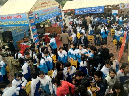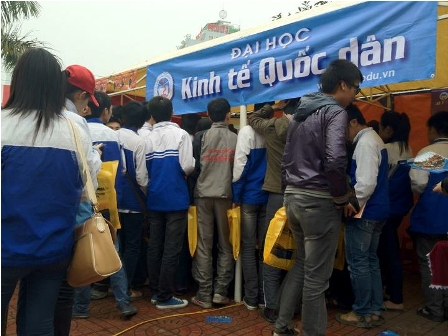 Thành phố Thanh Hóa chào đón buổi tư vấn tuyển sinh năm 2012 bằng tiết trời se lạnh và mưa. Tuy nhiên không phải vì thế mà không khí chuẩn bị các gian trại tư vấn của các trường kém phần sôi nổi mà ngược lại nhịp độ công việc lại càng được đẩy nhanh để kịp với giờ khai mạc vào lúc 7h sáng. Gian trại của chúng tôi nằm ở vị trí hơi khuất hơn so với các gian trạikhác nhưng với sự sáng tạo trong việc trang trí và sắp xếp của các em sinh viên thuộc đội tư vấn đã thu hút được sự quan tâm của các em học sinh đến từ nhiều trường điểm của thành phố Thanh Hóa, đặc biệt là hoc sinh của trường Chuyên Lam Sơn và trường THPT Đào Duy Từ. Dù trời mưa mà không có dấu hiệu ngớt nhưng các em học sinh vẫn rất háo hức đội mưa để đến lắng nghe sự tư vấn từ phía các cán bộ Chương trình IBD, đồng thời cũng để nhận được những thông tin cập nhật mới nhất về đợt tuyển sinh năm 2012 của Trường đại học Kinh tế Quốc dân.