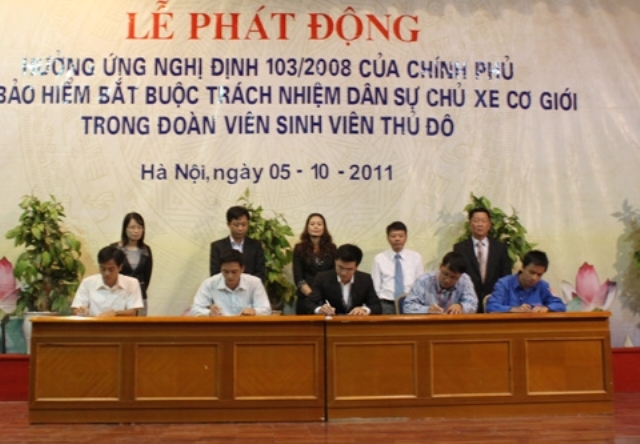 Kết thúc chương trình, Đại diện của 5 cụm trường ĐH, CĐ tại Hà Nội cùng chung tay ký cam kết tham gia hưởng ứng Nghị định số 103/2008/NĐ-CP của Chính phủ về “Bảo hiểm bắt buộc trách nhiệm dân sự chủ xe cơ giới”.