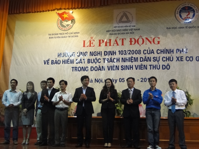 Nhằm đẩy mạnh công tác tuyên truyền, giáo dục cho Tuổi trẻ Thủ đô nâng cao ý thức, trách nhiệm trong việc thực hiện nghiêm túc luật An toàn giao thông đường bộ, sáng 5/10/2011 tại Nhà văn hoá ĐH KTQD đã diễn ra Lễ phát động hưởng ứng Nghị định số 103/2008/NĐ-CP của Chính phủ về “Bảo hiểm bắt buộc trách nhiệm dân sự chủ xe cơ giới” trong Đoàn viên, Sinh viên do Ban Tuyên giáo TW Đoàn, Thành đoàn HN, Hiệp hội Bảo hiểm Việt Nam phối hợp với Đoàn TN Trường ĐH KTQD tổ chức thực hiện. Tới tham dự chương trình có: Đồng chí Cao Xuân Thạo – Phó trưởng ban Tuyên giáo TƯ Đoàn TNCS HCM; ông Phùng Đắc Lộc – Tổng thư ký Hiệp hội Bảo Hiểm Việt Nam ; Đ/c Nguyễn Hồng Chi – Đại diện cục giám sát quản lý tài chính Bộ Tài chính; Đ/c Bạch Liên Hương – Phó bí thư Thành đoàn Hà Nội; PGS.TS Đào Phương Liên – Chủ tịch Công đoàn trường ĐH KTQD; Ths. Nguyễn Hoàng Hà – Bí thư Đoàn trường cùng đông đảo các bạn đoàn viên, sinh viên các trường đóng trên địa bàn Hà Nội.