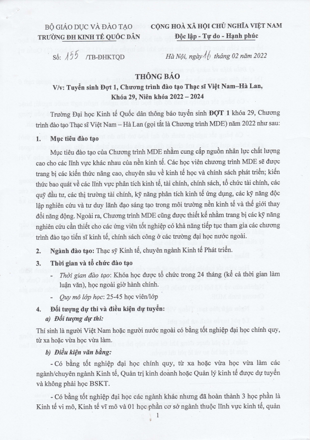 Tuyển sinh Cao học Việt Nam – Hà Lan năm 2022 Đang tuyển sinhThông báoThông báo tuyển sinhTuyển sinh Cao học Việt Nam – Hà Lan năm 2022 Các thí sinh quan tâm có thể tham khảo thêm thông tin tại website: http://mde.neu.edu.vn/MDE29_Thông báo TS_2022.pdf Thông báo về việc đề xuất nhiệm vụ đề tài cấp Bộ thực hiện từ năm 2024 Kinhtemoitruong.vn: TS Nguyễn Công Thành: Cải thiện diện tích công viên cây xanh đô thị: Nỗi lòng của người dân Thủ đô