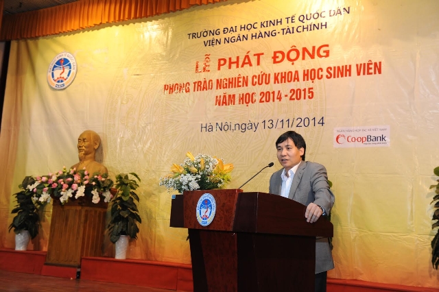 Phát biểu khai mạc Hội nghị, TS. Đặng Ngọc Đức – Phó Viện trưởng phụ trách Viện NH-TC đã nhấn mạnh về vai trò của công tác NCKH đối vớiviệc học tập và trau dồi kiến thức, kỹ năng của các bạn sinh viên khi còn ngồi trên ghế Nhà trường; đồng thời khẳng định vai trò, trách nhiệm của tổ chức Đoàn, các thầy cô giáo trong toàn trường trước việc hỗ trợ các bạn sinh viên thực hiện các công trình NCKH. Trước không khí hưởng ứng tham gia hết sức tích cực của đông đảo sinh viên Nhà trường, đặc biệt là sinh viên Viện NH-TC đối với Hội nghị Phát động NCKH sinh viên năm học 2014-2015 do Liên chi đoàn Viện NH-TC chủ trì tổ chức, TS. Đặng Ngọc Đức tin tưởng rằng, với khí thế và tinh thần đó, cùng với sự hỗ trợ tích cực, trách nhiệm của Đoàn trường, các thầy cô giáo, phong trào sinh viên NCKH của Nhà trường, đặc biệt là phong trào sinh viên NCKH của Viện NH-TC năm học 2014 – 2015 sẽ gặt hái được nhiều thành công hơn nữa.