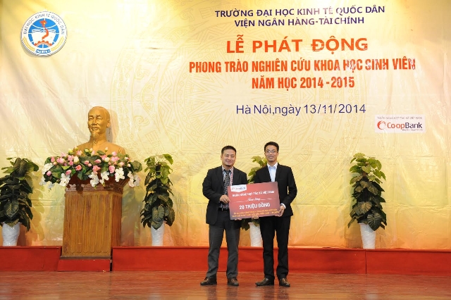 TS. Đặng Ngọc Đức phát biểu, chính thức phát động phong trào NCKH cho sinh viên Viện NH-TC. Hội nghị lần này vinh dự được đón tiếp Ông Nguyễn Thạc Tâm – Phó Tổng Giám đốc ngân hàng Hợp tác xã Việt Nam, đại diện nhà tài trợ. Với mục tiêu hỗ trợ sinh viên đạt kết quả học tập tốt và khích lệ những sinh viên có thành tích cao trong Phong trào NCKH sinh viên, Ngân hàng Hợp tác xã Việt Nam tài trợ cho Quỹ Nghiên cứu khoa học sinh viên và hoạt động thanh niên của Viện NH-TC suất học bổng trị giá 20 triệu đồng. Đại diện Ban Lãnh đạo Viện NH-TC, TS. Đặng Ngọc Đức đã gửi lời cảm ơn sâu sắc tới đại diện Ngân hàng Hợp tác xã Việt Nam, đặc biệt là ông Nguyễn Thạc Tâm – Phó Tổng Giám đốc ngân hàng Hợp tác xã Việt Nam đã tham dự Hội nghị để cùng mang đến cho các em sinh viên nguồn động viên khích lệ to lớn.
